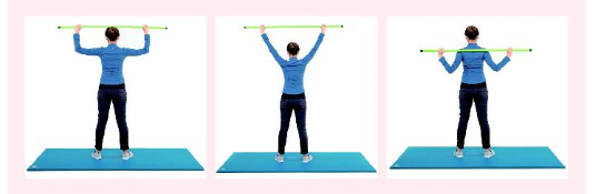 이제 마무리운동이다. 늘어난 팔올림 기능을 올바른 자세로 연결하기 위해선 견갑골 셋팅이 필요하다.(그림5) 머리 위에 스트레칭 봉을 올려놨을 때 팔꿈치가 90도 정도 구부러진 상태가 되도록 손을 위치시킨 후 스트레칭 봉을 등 뒤로 내려준다. 내린 상태에서 5초 버틴 후 다시 올리기를 5회 반복한다.