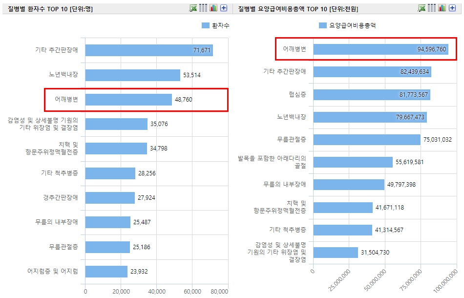 <참고자료1> 2019년 50대 질병별 환자 수 및 요양급여비용총액 TOP10. 심평원 발표자료.
