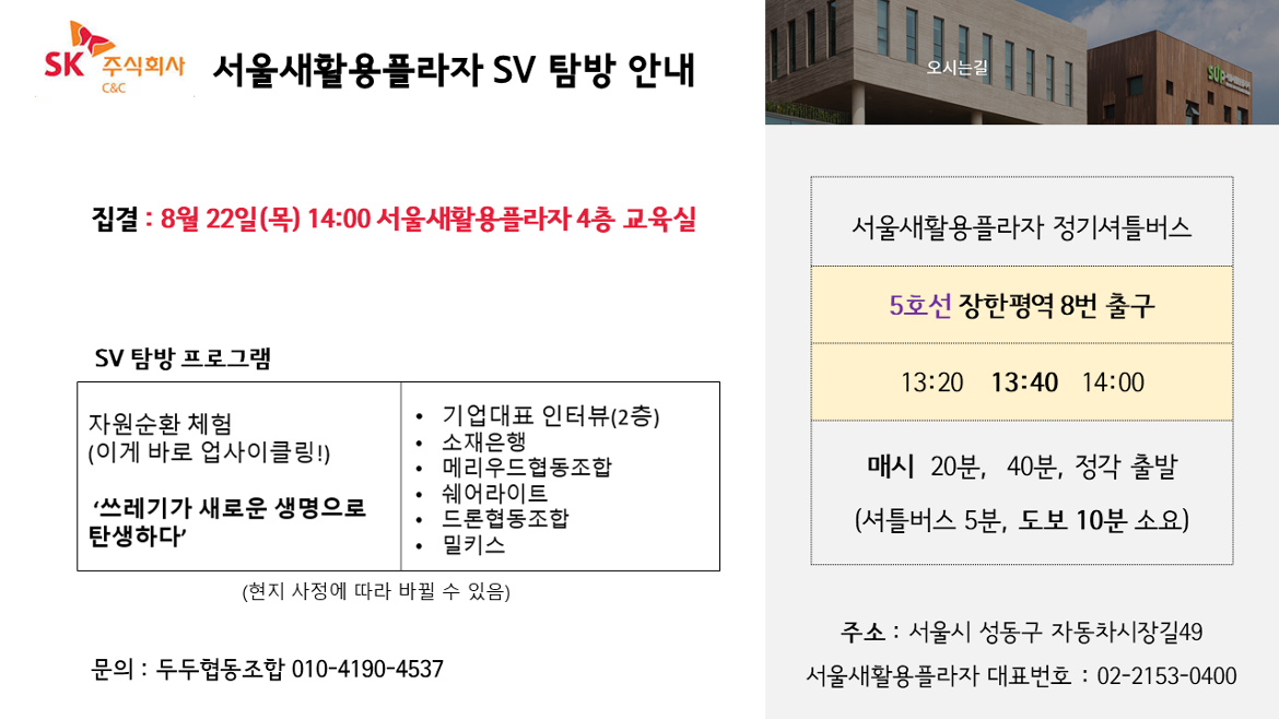 ■ 주요내용 : 두두협동조합이 sk주식회사 서울새활용플라자 SV 탐방을 22일과 28일 2일간 진행하였습니다.