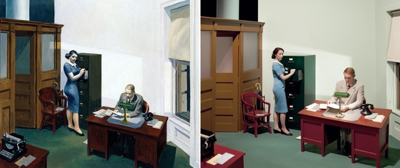 (왼쪽) 에드워드 호퍼 < Office at Night,1940> (출처_wikipedia.org)                        (오른쪽) 영화 <셜리에 관한 모든 것>(2013) 스틸컷