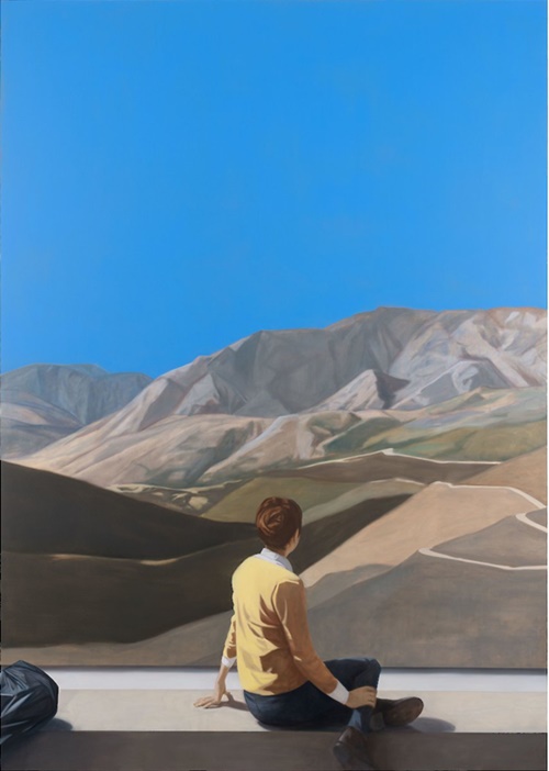시원하고 높고 푸른 하늘 아래 굽이굽이 인생길 같은 산맥을 바라보는 한 사람이 있습니다. 실은 눈을 감고 있을지도 모르죠. 여자일수도 혹은 남자일수도 있습니다. 왼쪽 다리를 오른손으로 지긋하게 잡고 있는 이유는 무엇일까요? 뒷모습이기에 알 수 없는 것, 그래서 그림의 여백을 관객의 생각으로 채워 넣어야 하는 것. 팀 아이텔의 그림은 주로 그런 것들입니다.