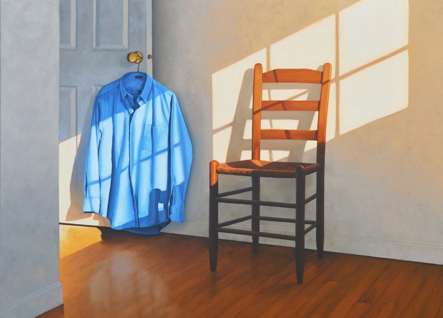 햇볕이 잘 드는 방에 의자 하나, 푸른색 셔츠 한 벌이 보입니다. 무심코 지나칠 법한 어쩌면 대수롭지 않을 방 안에 작가는 왜 주목했을까요? 포근한 햇살을 맞으며 사물도 낮잠을 잘 것 같은 평화로운 한낮, 잘 다려져 주름 한 점 없는 저 셔츠의 주인은 어디에 있을까요? 과연 이 그림 밖에는 어떤 이야기가 숨 쉬고 있을까요?