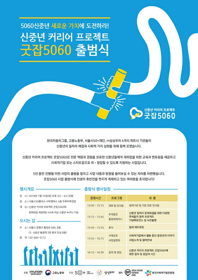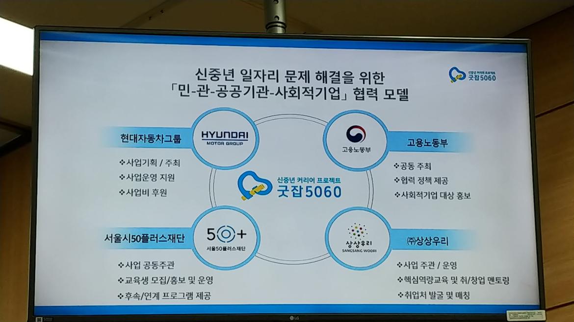 지난 7월 10일, '굿잡5060 - 신중년 커리어 프로젝트 출범식'이 서울시50플러스 서부캠퍼스 4층 강당에서 열렸다. 이번 행사는 고용노동부(정부), 현대자동차그룹(기업), 상상우리(사회적기업), 서울시50플러스재단(공공기관) 등 4개의 기관이 협력하는 프로젝트이다. 고용노동부는 공동기획과 협력정책 제공, 사회적 기업대상 홍보로 인생 3모작 기반 구축을 담당하고, 현대자동차그룹은 프로젝트 총괄기획, 사업운영지원, 사업비를 후원한다. 서울시50플러스재단은 교육생 선발워크숍 운영, 후속 연계프로그램 제공으로 신중년 세대와 기업참여를 유도 할 계획이다. 사회적기업인 상상우리는 신중년 세대의 유의미한 이전 경력과 경험을 포함한 핵심역량강화교육, 취업과 창업 멘토링, 후속교육 및 사후관리를 담당할 예정이다.