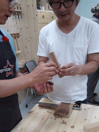 8월 상 만들기 프로젝트의 2회 차 수업은 작품을 만들기 위한 톱질하는 방법을 익히고 반턱맞춤을 위해 톱으로 잘라보며, 단단한 나왕나무를 이용해서 장부 홈파기 실습이다. 트리머라는 공구 사용으로 수고로움을 덜 수 있지만 최종적으로 톱과 끌을 사용해야하기 때문에 그 사용법을 배운다.