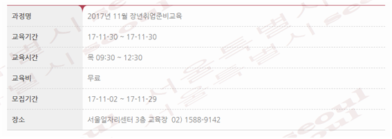 이번 11월 장년취업준비교육은 11월 30일에 ‘서울일자리플러스센터 내 교육장’에서 진행이되고 강의 내용으로는