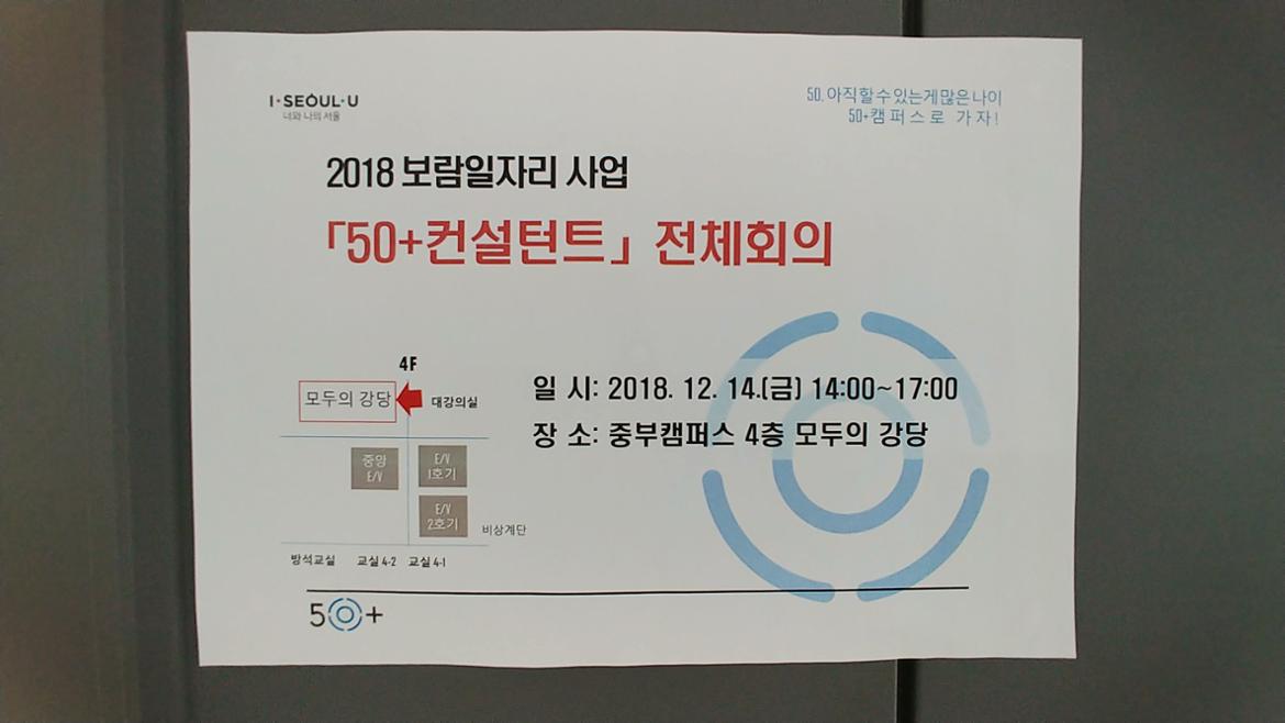 지난 12월 중순에 50+컨설턴트 전체모임이 중부캠퍼스 4층 모두의 강당에서 진행 되었다. 50+컨설턴트 사업단은 50+중부캠퍼스가 운영하는 보람일자리 핵심 사업으로 2018 마무리를 위한 자리였다. 총 67명의 컨설턴트가 한 해 동안 10번의 모임으로 밀접한 교류로 친분을 쌓아 왔다.
