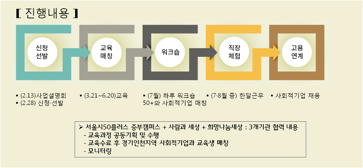 기술과 경험을 갖춘 50+전문인력과 사회적기업과의 매칭을 통해 사회적기업의 전문성을 높이고 의미있는