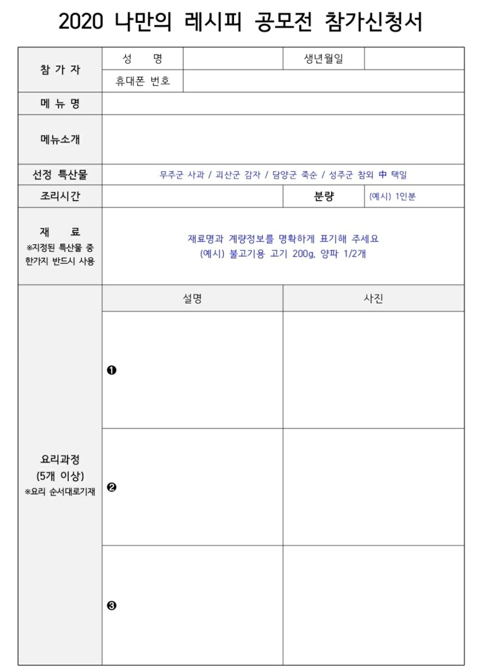 제일 중요한 요리 메뉴명, 메뉴 소개, 조리시간, 분량, 재료, 요리과정을 담은 사진, 완성된 사진 등을 첨부하셔야 합니다.