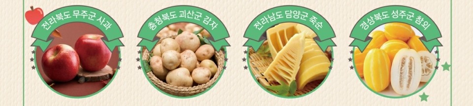 전라북도 무주군 사과, 충청북도 괴산군 감자, 전라남도 담양군 죽순, 경상북도 성주군 참외까지.