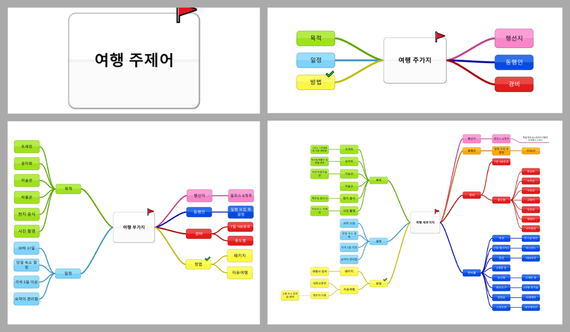 한가지 예로 마인드맵 프로그램인 MindMaps Pro를 이용해 여행계획을 세워보자. 먼저 한가운데 주제어 또는 제목을 쓰고 주 가지로 목적지, 동행인, 경비, 목적, 일정, 여행방법, 준비물 등을 그려 넣는다. 그리고 다시 부 가지로 주 가지에 대한 설명, 분류, 종류 등을 적는다. 준비물이라면 여권, 신용카드, 현금, 복장, 취사도구, 스마트폰 등을 쓸 수 있겠고, 여행목적에는 트레킹, 음악회, 현지 음식, 사진 촬영, 관광지 방문 등을 넣을 수 있다. 다음 세부 가지로 더 자세한 나눔과 설명을 적어 마인드맵을 완성한다. 여행 장소라면 구체적 국가와 지역, 여행 경비로는 용도별로 항공료, 숙박료, 식음료비, 체험비 등을 세부적으로 배분할 수 있다. 이렇게 완성된 마인드맵은 계획이나 실행단계에서 언제든 수정할 수 있다. 이처럼 마인드맵은 계획 세우기 뿐 아니라 행사와 프로젝트의 기획, 독서와 취재 등 정보의 정리에 유용하고 스피치 메시지를 구성하고 강의안을 작성하는 등 다양한 콘텐츠 마련에 두루 활용할 수 있다.