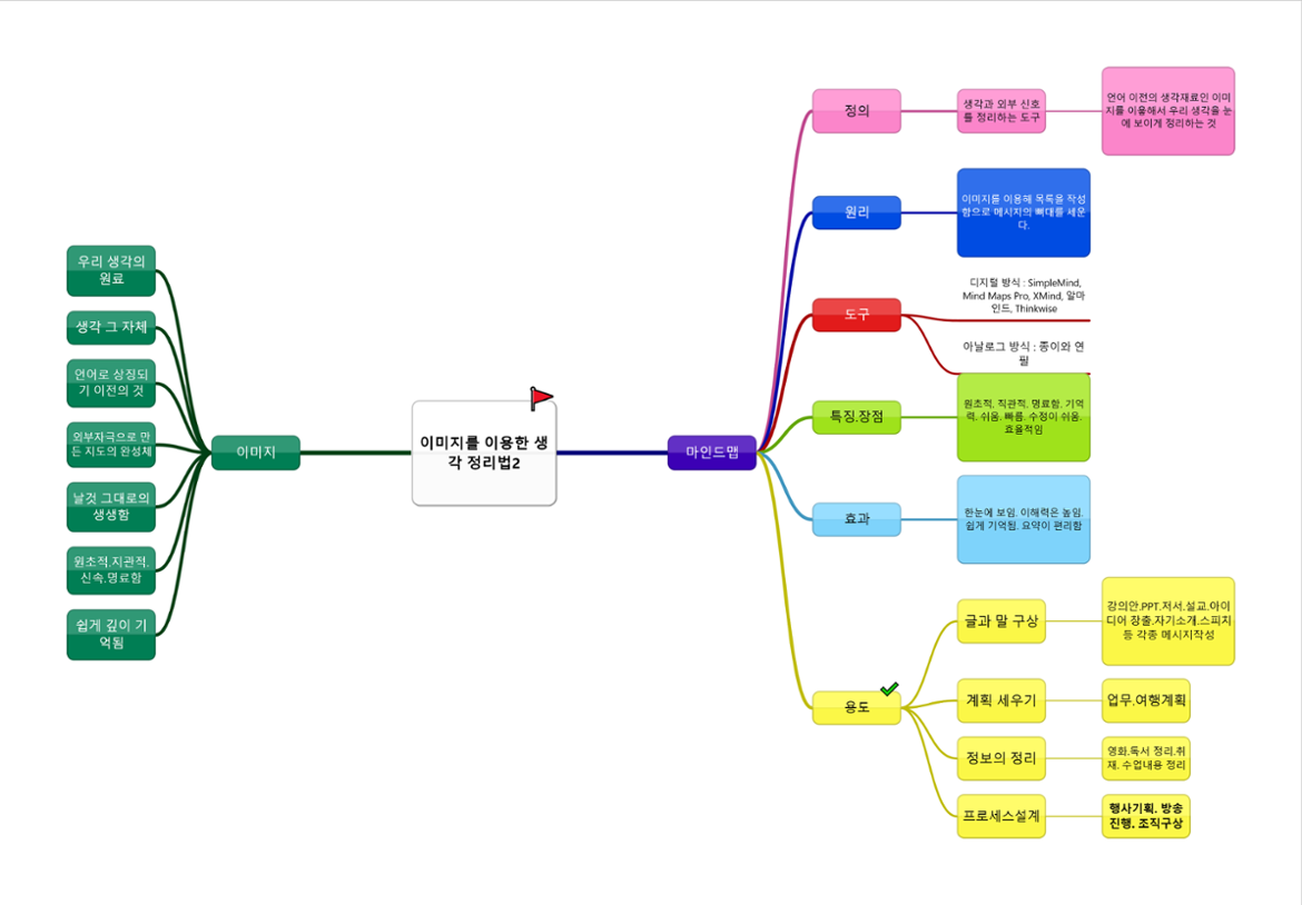 우리 생각의 원료이자 그 자체이기도 한 이미지는 언어로 상징되기 이전의 것이다. 외부에서 오는 온갖 자극들을 바탕으로 만든 지도의 완성체라고 할 수 있다. 이미지의 생각은 언어의 생각에 비해 날 것 그대로의 생생함을 지니고 있다. 즉 원초적이고 직관적이며 신속하고 명료하다. 그리고 기억의 저장고 깊은 곳까지 쉽게 도달한다. 이런 특성을 이용해서 생각을 정리하면 순수하게 언어만 사용해서 생각을 정리하는 것보다 훨씬 빠르고 수월하고 명확하게 생각을 정리할 수 있다. 이는 좌회전과 우회전을 여러 번 반복해야 하는 길 안내를 글이나 말로 하는 것보다 지도 한 장으로 깔끔하게 대신하는 것과 같은 원리이다.