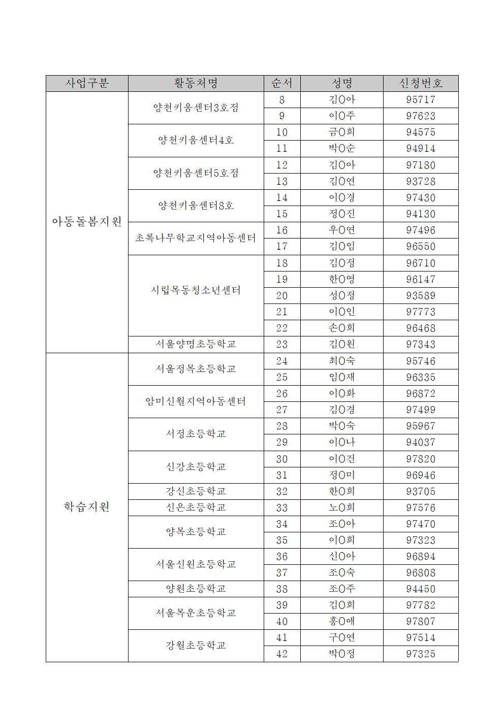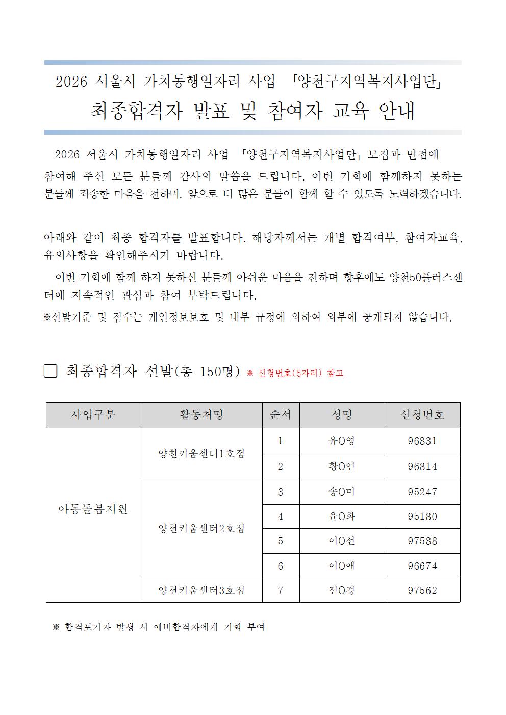 서울시 양천센터 | [합격자발표]2026년 서울시 가치동행일자리사업 양천구 지역복지사업단 최종합격자 발표 및 참여자 교육 안내